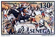 Pendant ce temps les royaumes noirs du fleuve sont décomposés par les invasions maures et Toucouleur. Dans les années 1850, les français changent radicalement leur politique économique en exploitant désormais l’arachide au lieu de la gomme. C’est également l’époque de la conquête de l’intérieur. Protêt édifie un véritable camp à Podor et en quatre ans repousse les Toucouleurs (1854). Cette même année, Faidherbe accentue la présence militaire française dans le Nord jusqu’à battre les Maures. La région est définitivement conquise et pacifiée avec la défaite du chef Toucouleur ElHadji Omar en 1859. Mais cette ardeur du colonisateur est freinée par des résistances très violentes à l’intérieur du pays : Maba Diakhou Bâ - Lat Dior Diop (photo en haut à gauche, statue de Lat Dior à Dakar, photo à gauche, timbre sénégalais commémorant la mort de Lat Dior)-